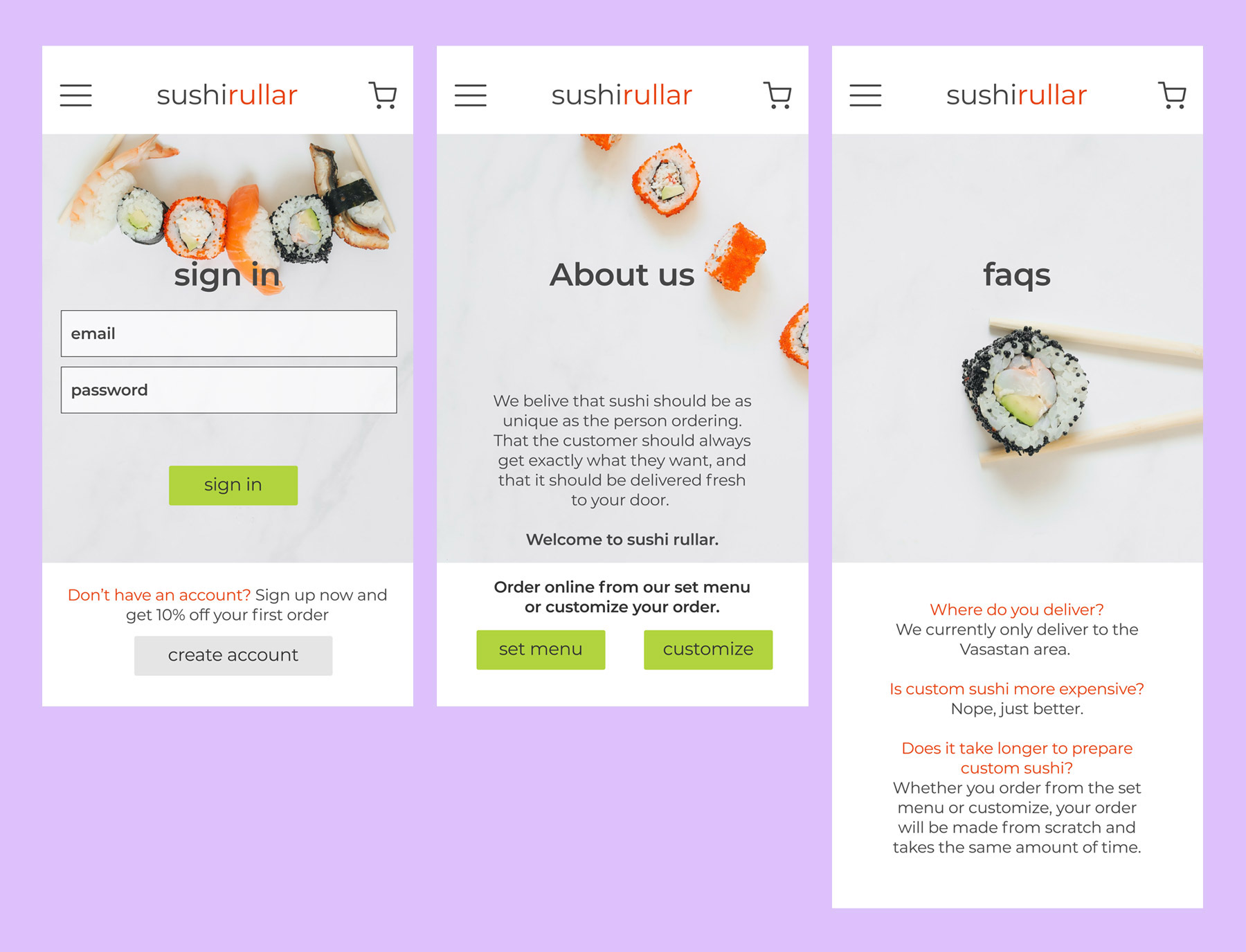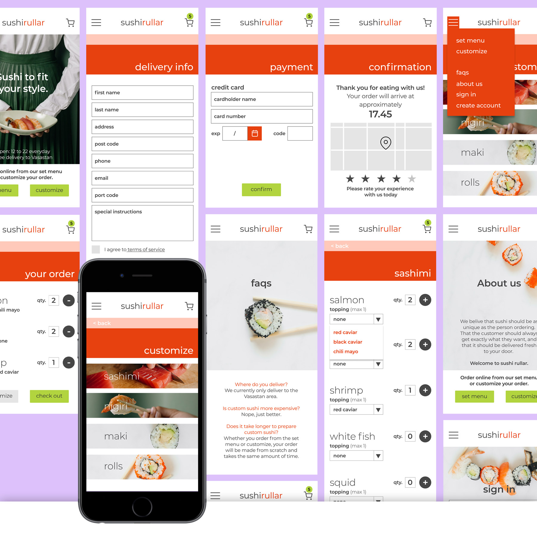 Sushi Rullar is a student assignment for a UX/UI specialization course. The challenge was to design a mobile first website for a customizable service. I chose sushi to fill a need for busy people with specific tastes and/or diet. The site would allow users to create an account and re-order once they've created the menu they want. The design has an emphasis on fashion as a means to create an experience as unique as the individual. Photos used in the project are from pexels.